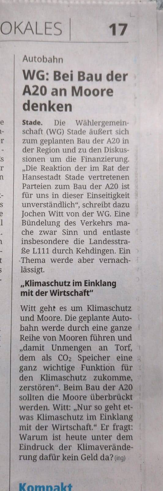 Stellungnahme der WG im Stader Tageblatt zur geplanten A20