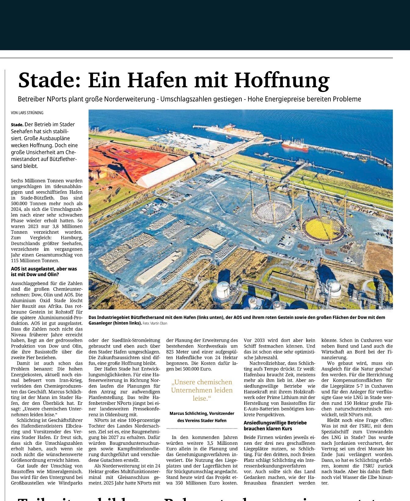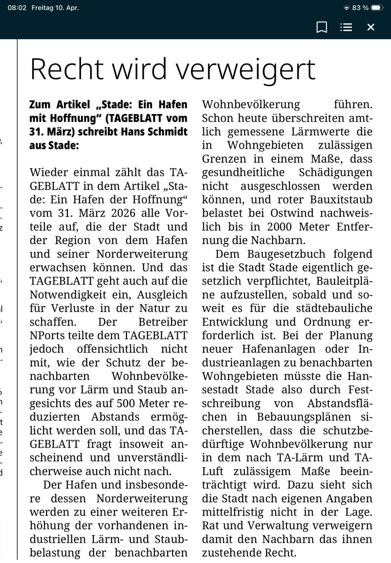 Der Artikel im Tageblatt vom 31.03.2026 geht nur auf die Vorteile der Hafenerweiterung ein.